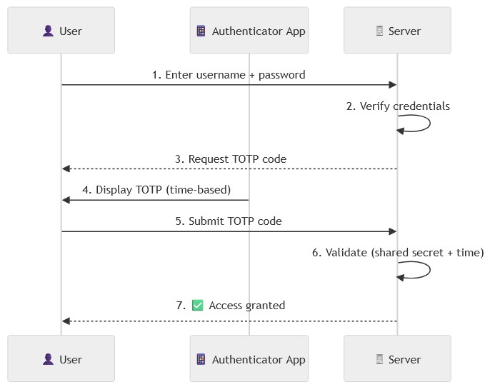 A Time-based One-Time Password (TOTP) is a security algorithm used as part of two-factor authentication (2FA) to protect against account attacks. The mechanism is integrated into dot-totp to enhance security by requiring both a password and an additional one-time code. Our implementation follows the industry standard of using an Authenticator app to generate temporary, unique 6 digit codes that change every 30 seconds.